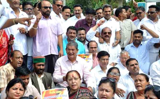 विधानसभा चैक पर सुबह दस बजे कांग्रेस के नेता व कार्यकर्ता धरने पर बैठे। धरने की अगुवाई पूर्व सीएम हरीश रावत ने की। इस दौरान हरीश रावत ने कहा कि कांग्रेस ने गैरसैण को विकसित करने का काम किया। ताकि वहां पर विधानसभा सत्र किया जा सके, लेकिन भाजपा सरकार ने गैरसैण में विधानसभा सत्र न करके गैरसैण समेत उत्तराखंड की जनता की भावनाओं को ठेस पहंुचायी है। उन्होंने यह भी कहा कि एनएच घोटाले को उजागर करने वाले अफसर को कुमाऊं आयुक्त के पद से हटा दिया गया। केंद्र सरकार ने भी सीबीआई जांच कराने से हाथ खड़े कर दिए। प्रदेश की भाजपा सरकार भी गंभीर नहीं दिख रही। कुल मिलाकर इस घोटाले को दबाने का काम किया जा रहा है। हरीश रावत ने कहा कि गौरा देवी व कन्या धन योजना का एकीकरण करके सरकार ने ठीक नहीं किया है। इसके साथ ही प्रदेश सरकार ने लोगों का राशन कम कर दिया है। मध्य प्रदेश में किसानों की हत्या के मामले में आक्रोश जताते हुए कहा कि किसानों को न्याय देने की बजाए उनके साथ अन्याय किया जा रहा है। इस दौरान मारे गए किसानों के लिए दो मिनट का मौन भी रखा गया। मौके पर हरीश रावत ने कहा कि इन सभी मामलों को लेकर वह हरिद्वार में आज हर की पैड़ी में एक घंटा तप करेंगे।इस मौके पर कांग्रेस प्रदेश अध्यक्ष प्रीतम सिंह, प्रदीप टम्टा, गोविंद सिंह कुंजवाल, मंत्री प्रसाद नैथानी, पूर्व विधायक राजकुमार, विक्रम सिंह नेगी, राजेंद्र भंडारी, कांग्रेस महासचिव गोदावरी थापली, जिला सहकारी बैंक अल्मोड़ा के अध्यक्ष प्रशांत भैंसोड़ा, लालचंद शर्मा, राजेंद्र शाह, नसीम, कमलेश रमन, नंदा देवी, चित्रकला थापली, राकेश रितेश जोशी आदि मौजूद थे।