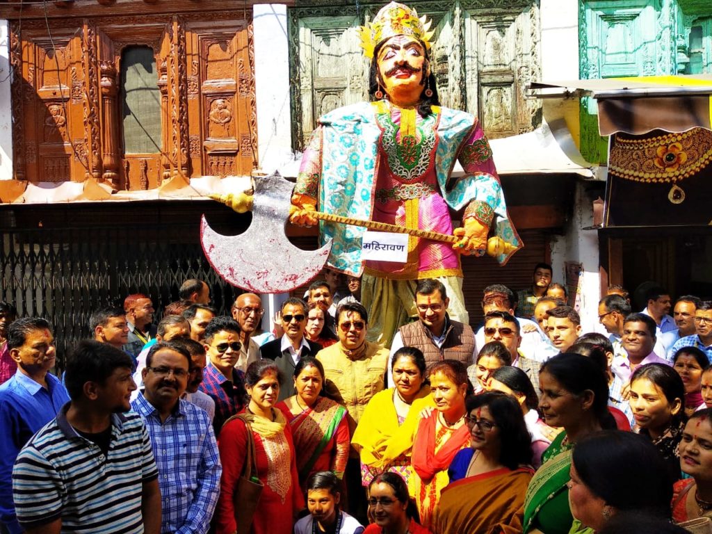 अल्मोडा। अल्मोड़ा में जिलाधिकारी नितिन सिंह भदौरिया की विशेष पहल पर ऐतिहासिक दशहरा महोत्सव में पहली बार अल्मोड़ा प्रशासन ने भी समाज को बेटी बचाओ बेटी पढ़ाओ के संदेश के साथ शिरकत की। रावण परिवार के पुतलों के बीच कलक्ट्रेट के कर्मचारियों द्वारा रिकॉर्ड 4 दिनों में बनाए पुतले के साथ प्रतिभाग किया। इस पुतले का नाम ‘महिरावण’ रखा गया है। जिलाधिकारी ने बताया की इस पुतले निर्माण का उद्देश्य समाज में दहेज हत्या व कन्या भ्रूण हत्या जैसी बुराईयों को जलाकर नष्ट करना है।