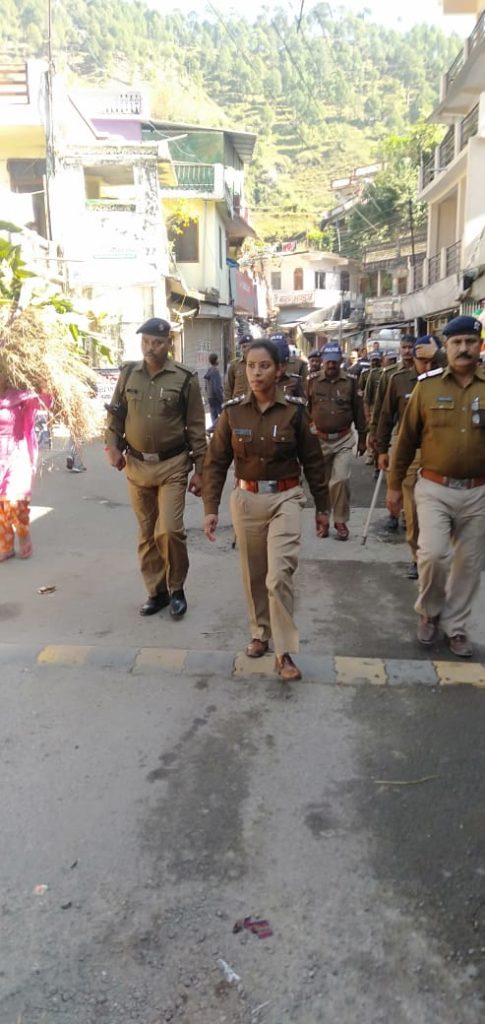 बागेश्वर। आज अयोध्या राम जन्म भूमि मामले में निर्णय आने के दृष्टिगत *श्रीमती प्रीति प्रियदर्शिनी पुलिस अधीक्षक महोदया बागेश्वर के आदेशानुसार* जनपद क्षेत्रान्तर्गत शांति व्यवस्था व साम्प्रदायिक सौहार्द बनाये रखने हेतु *श्री महेश चन्द्र जोशी पुलिस उपाधीक्षक महोदय बागेश्वर* द्वारा कोतवाली बागेश्वर क्षेत्रान्तर्गत, *सुश्री संगीता पुलिस उपाधीक्षक महोदया कपकोट* द्वारा थाना कपकोट क्षेत्रान्तर्गत व *उ0नि0 श्री कैलाश बिष्ट थानाध्यक्ष बैजनाथ* द्वारा थाना बैजनाथ क्षेत्रान्तर्गत फ्लैग मार्च किया गया, क्षेत्र की सम्मानित जनता से माननीय उच्चतम न्यायालय के निर्णय का सम्मान करते हुए शांति व्यवस्था एवं साम्प्रदायिक सौहार्द बनाये रखने की अपील की गयी व बताया गया कि सोशल मीडिया पर किसी भी प्रकार की अफवाहें/भ्रामक सन्देश ना फैलाएं।