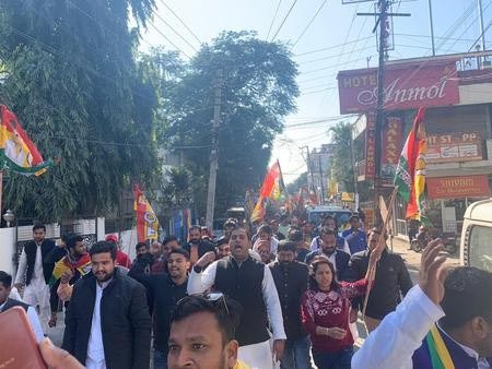 इससे पहले पार्टी के राष्ट्रीय उपाध्यक्ष योगेश मिश्रा की अगुवाई में बड़ी संया में कार्यकर्ता धरना स्थल पहुंचे। यहां केंद्र और राय सरकार के खिलाफ प्रदर्शन कर नारेबाजी की। इसके बाद दोपहर 1.30 बजे धरना स्थल से सचिवालय के लिए पैदल मार्च किया। पैदल मार्च से पूर्व धरना स्थल पर कार्यकर्ताओं ने सिटी मजिस्ट्रेट अनुराधा पाल के माध्यम मुयमंत्री और प्रधानमंत्री के नाम ज्ञापन प्रेषित किया।