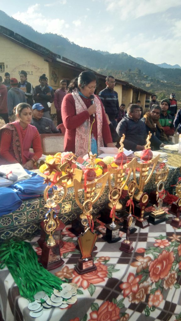 टूर्नामेंट के पुरस्कार वितरण समारोह में क्षेत्र में पहली बार आई मुख्य अतिथि जिला पंचायत अध्यक्ष बागेश्वर बसन्ती देव ने अपने सम्बोधन में खिलाड़ियों को प्रोत्साहित करते हुए कहा कि इस दूरस्थ इलाके में इस प्रकार का खेल आयोजन देखकर मैं काफी प्रसन्न हुई हूँ। साथ ही उन्होंने खेल मैदान की सुरक्षा दीवार हेतू 1 लाख रुपए देने के साथ 2 क्षेत्र के समस्त खिलाड़ियों को हरपल सहयोग देने का आश्वासन भी दिया ।