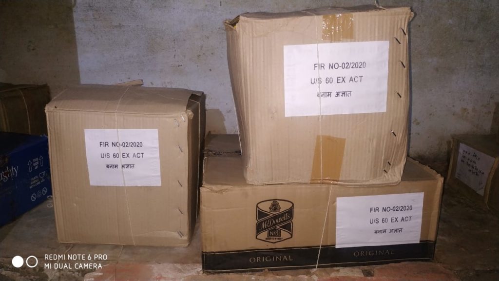 अल्मोड़ा । श्री प्रहलाद नारायण मीणा, वरिष्ठ पुलिस अधीक्षक अल्मोड़ा द्वारा लाॅक डाउन के नियमों का सख्ती से पालन कराने हेतु* सभी थाना प्रभारियों को दिये गये निर्देश पर दिनांकः 29.03.2020 को द्वाराहाट पुलिस ने दौराने *रेवाड़ी बग्वाली पोखर में गुरूकृपा रेस्टोरेन्ट के पास बन्द पड़े टिन सेड* पर रखी गयी 02 पेटी में 48-48 पव्वे देशी मसालेदार एवं एक पेटी में 47 पव्वे अंग्रेजी मैकडाॅवेल व्हिस्की अंग्रेजी शराब बरामद की है। इस सम्बन्ध में *थानाध्यक्ष द्वाराहाट* श्री अजय लाल साह ने बताया कि गोपनीय सूचना के आधार पर *बन्द पड़े टिन सेड चैक किये जाने पर छुपा कर रखी गयी 96 पव्वे देशी व 47 पव्वे अंग्रेजी शराब कुल-143 पव्वे बरामद कर (कीमत-15200रूपये)* थाना द्वाराहाट में अज्ञात के विरूद्व मु0अ0सं0- 02/2020 धारा-60 आबकारी अधिनियम के अन्तर्गत अभियोग पंजीकृत किया गया।