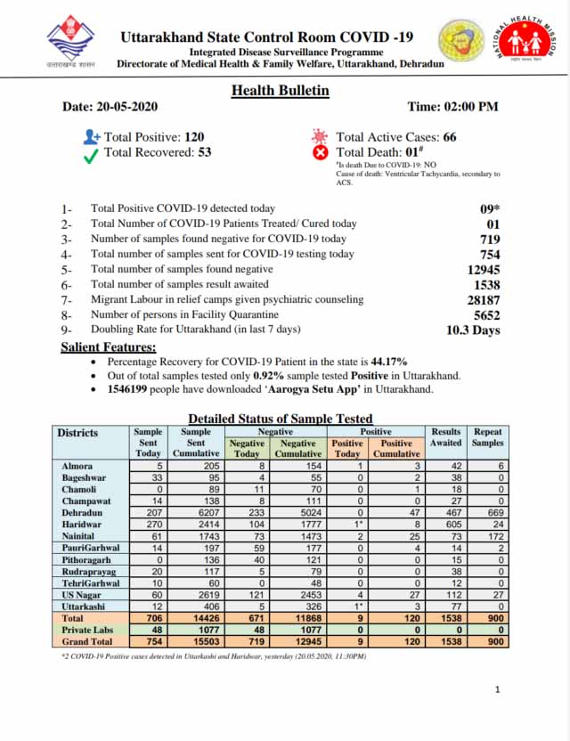 प्रदेश में बुधवार शाम तक कुल 09 कोरोना संक्रमितों के मिलने से मरीजों की संया 111 से बढ़कर 120 पहुंच गई थी। सात नए कोरोना मरीजों में उधमसिंह नगर जिले से चार, नैनीताल से दो, और अल्मोड़ा से भी एक मामले सामने आए हैं।