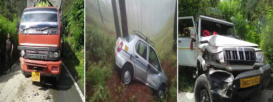 बागेश्वर। कोतवाली पुलिस क्षेत्र के अंतर्गत कलना बैंड के पास एक मैक्सी जीप और ट्रक की भिड़ंत हो गई। इस हादसे में जीप सवार एक युवक घायल हो गया। उसे वाहन में बैठे अन्य साथी जिला अस्पताल ले गए। प्राथमिक उपचार के बाद युवक को छुट्टी दे दी। वह सात दिन के क्वारंटाइन के बाद अपने घर खातीगांव जा रहा था। वाहन में बैठे अन्य सवारियों को खरोंच तक नहीं आई। कोतवाली पुलिस से मिली जानकारी के अनुसार रविवार अपराह्न तीन बजे बागेश्वर में मैक्स जीप संया यूके 02-टीए-1623 कांडा की ओर जा रही थी। कांडा से आ रहे टक संया यूके- 04-सीए- 5828 की कलना बैंड के पास भिडंत हो गई। इस हादसे में खातीगांव निवासी 17 वर्षीय अभिषेक मेहता पुत्र भरत मेहता घायल हो गया। वाहन में बैठे अन्य लोगों ने घायल को जिला अस्पातल पहुंचाया। प्राथमिक उपचार के बाद उसे छुट्टी दे दी। इस दौरान मार्ग पर आधे घंटे तक जाम लगा रहा। बाद में पुलिस ने जाम खुलवाया। इस मामले में किसी ने भी रिपोर्ट दर्ज नहीं कराई है। एक अन्य घटना में पौड़ी बैंड के पास एक कार संया यूके 08- टीए- 5167 खाई में गिर गई। गनीमत रही की कार पेड़ से टकरा गई। वरना कार गहरी खाई में गिर जाती। पुलिस के अनुसार कार में चालक सोहन सिंह पुत्र चंदन सिंह निवासी रानीपुर हरिद्वार के अलावा जनौटी पालड़ी निवासी मनोज सिंह पुत्र दरवान सिंह बैठा था। हरिद्वार से आने के कारण उसे जांच के लिए बिलौना पहुंचना था। युवक मां शव यात्रा में शामिल होने के लिए हरिद्वार से घर आ रहा था।