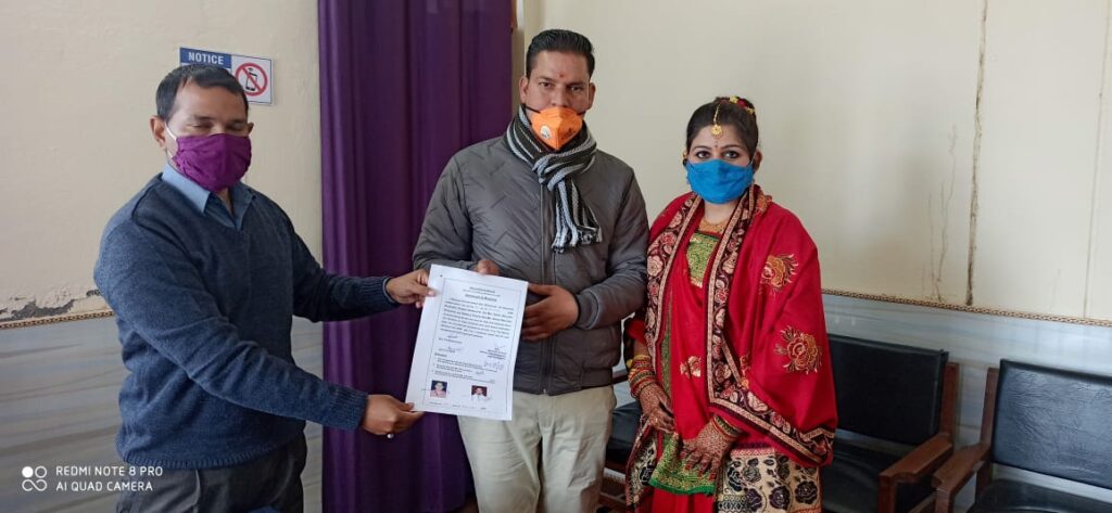 बागेश्वर गरुड़ । जनपद गठन के बाद जनपद में विशेष विवाह पंजीकृत की व्यवस्था लागू नहीं हो पायी थी, जिसके लिए जिलाधिकारी विनीत कुमार ने आम जनता के जनहित में एक बेहतर पहल करते हुए विशेष विवाह अधिनियम 1954 के अंतर्ग्ात सभी उपजिलाधिकारियों को विशेष विवाह अधिकारी नामित किये गये है। जिसके फलस्वरूप जनपद बागेश्वर के तहसील गरूड में पहला कोर्ट विवाह आज पंजीकृत करते हुए विशेष विवाह अधिकारी/ उपजिलाधिकारी गरुड जयवर्द्धन शर्मा़ ने वर श्री राजेन्द्र प्रसाद दुर्गापाल एवं वधु निर्मला पाण्डेय को स्पेशल मैरिज अधिनियम 1954 के अंतर्गत विवाह की शपथ ग्रहण करायी और तीन गवाहों की उपस्थिति में विवाह पंजीकृत किया गया। उपजिलाधिकारी गरुड़ ने नव दम्पत्ति को विवाह प्रमाणपत्र प्रदान करते हुए उनके सुखी दाम्पत्य जीवन व्यतीत करने व उनके उज्जवल भविष्य के लिए शुभकामनाएं दी।