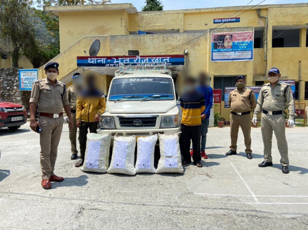अल्मोड़ा । श्री पंकज भट्ट, वरिष्ठ पुलिस अधीक्षक अल्मोड़ा द्वारा सभी थाना चौकी प्रभारियों को अपने-अपने क्षेत्र में अवैध रूप से गाँजा/चरस व अन्य नशीली पदार्थो की तस्करी कर रहे तस्करों पर कार्यवाही करने के निर्देश पर दिनांक- *10.05.2021* को प्रभारी चौकी भिकियासैण उ0नि0 देवेन्द्र सिंह सामन्त, आरक्षी शमीम अहमद, महेन्द्र कुमार, सुरेश कोरंगा चैकिंग के दौरान चौकी तिराहा भिकियासैण के पास वाहन सं0 *DL1VB- 8227 टाटा सूमो* में *1-विजय रावत पुत्र दिनेश रावत निवासी भटवाड़ा तहसील थलीसैंण जिला पौड़ी गढ़वाल 2- ईश्वर गुसाईं पुत्र धीरेंद्र सिंह गुसाईं निवासी सिली टल्ली थाना थलीसैंण जिला पौड़ी गढ़वाल 3-ताज वर सिंह पुत्र वीरेंद्र सिंह निवासी सिली टल्ली थाना थलीसैंण जिला पौड़ी गढ़वाल के पास से चार कट्टों में कुल 51. 742 किलोग्राम अवैध गांजा कीमत ₹207000.00 परिवहन करते हुए पकड़े जाने पर थाना भतरौजखान में मु0 अ0 सं0 15 /21 धारा 8/20/60 एन0डी0पी0एस0 एक्ट* पंजीकृत कर वैधानिक कार्रवाई की गई।
