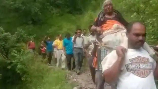 डंडी में बिठाकर पहुंचाया बीमार वृद्धा को अस्पताल -स्वीकृत खांकरा-भूमरागढ़-पौड़ीखाल मोटरमार्ग पर शिलान्यास के बावजूद नहीं हुआ निर्माण कार्य