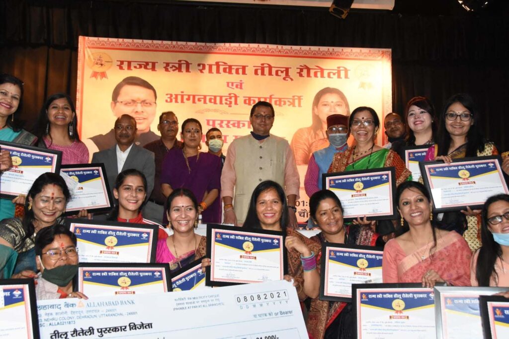 देहरादून। मुख्यमंत्री पुष्कर सिंह धामी ने घोषणा की है कि अगले वर्ष से तीलू रौतेली पुरस्कार एवं आंगनबाड़ी कार्यकत्री पुरस्कार की धनराशि बढ़ाकर 51 हजार रूपये किया जायेगा। भारतीय महिला हॉकी टीम की खिलाड़ी वन्दना कटारिया उत्तराखण्ड में महिला सशक्तीकरण एवं बाल विकास विभाग की ब्रांड एम्बेसेडर होंगी। मुख्यमंत्री पुष्कर सिंह धामी ने सर्वे चौक स्थित आई.आर.डी.टी सभागर में ‘‘ तीलू रौतेली पुरस्कार एवं ‘‘आंगनबाड़ी कार्यकत्री पुरस्कार‘‘ हेतु चयनित राज्य की महिलाओं को सम्मानित किया। इस वर्ष 22 महिलाओं को तीलू रौतेली पुरस्कार एवं 22 महिलाओं को आंगनबाड़ी कार्यकत्री पुरस्कार से सम्मानित किया गया है। तीलू रौतेली पुरस्कार प्राप्तकताओं को 31 हजार रूपये की सम्मान धनराशि एवं प्रशस्ति पत्र प्रदान किया गया। जबकि आंगनबाड़ी कार्यकत्री पुरस्कार के तहत 21 हजार रूपये की सम्मान राशि एवं प्रशस्ति पत्र प्रदान किया गया।