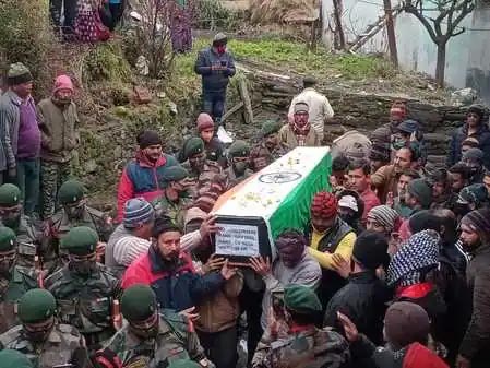 चमोली। मणिपुर में तैनात असम राइफल के सैनिक और सगर गांव के निवासी गजेन्द्र सिंह नेगी का अंतिम संस्कार बुधवार को उनके पैत्रिक घाट पर गमगीन माहौल में हुआ। ड्यूटी के दौरान हृदय गति रुकने के कारण जवान गजेंद्र सिंह नेगी का देहावसान हो गया था। बुधवार को सेना के जवान सैनिक गजेन्द्र सिंह नेगी के पार्थिव शरीर को सेना के वाहन से लेकर उनके गांव सगर पहुंचे। सैनिक के पार्थिव शव को देखकर गांव इलाके में शोक की लहर छा गयी। सैनिक के पार्थिव शरीर को करीब एक घंटे तक अंतिम दर्शनों के लिये उनके आवास पर रखा गया। इसके बाद पार्थिव शरीर को उनके पैतृक घाट पर लाया गया। जहां उनका विधि विधान के साथ अंतिम संस्कार किया गया। सैनिक की अंतिम यात्रा में ग्रामीणों का हुजूम उमड़ पड़ा।
