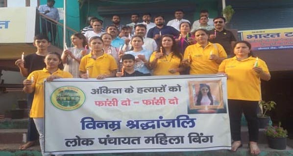 लोक पंचायत की महिला इकाई ने कैंडल जलाकर श्रद्धांजलि दी। इसके साथ ही हत्यारों को फांसी दिलाए जाने के समर्थन में हस्ताक्षर अभियान चलाया। डा. राजकुमार चौहान ने कहा कि उत्तराखंड में इस तरह के घृणित अपराध रोकने जरूरी हैं। मीरा चौहान ने कहा कि अंकिता हत्याकांड से लोगों में भारी आक्रोश है। देवभूमि में इस तरह के अपराध स्वीकार नहीं किया जा सकता है। उन्होंने हत्याकांड में शामिल सभी दोषियों को फांसी की सजा दिए जाने की मांग की। इस दौरान डा. पूजा राठौर, रोशनी, मीनाक्षी, शिल्पा, मनीषा, लक्ष्मी तोमर, नीतू चौहान आदि मौजूद रहे।