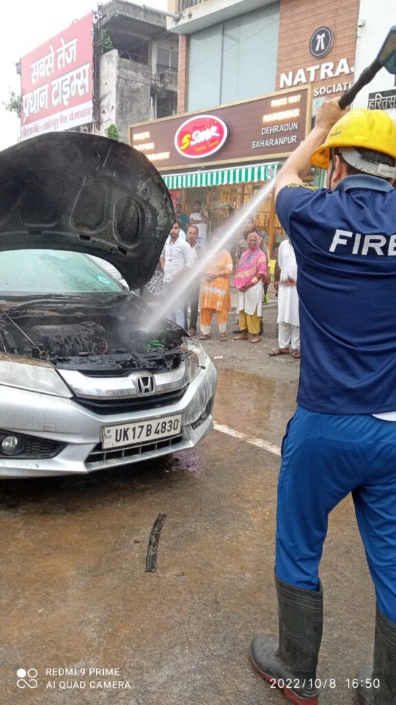 हरिद्वार। उद्योगपति जेसी जैन की होडा सिटी कार में आग लगने से हड़कंप मच गया। कार में आग लगने की सूचना पर मौके पर पहुंचे फायरकर्मियों ने कार में लगी आग को बुझाया। उद्योगपति जेसी जैन के परिवार के बच्चे कार चालक व केयर टेकर के साथ खरीददारी करने के लिए बाजार जा रहे थे। कार जैसे ही पुराने रानीपुर मोड़ के पास पहुंची। कार से अचानक धुंआ उठने लगा। देखते ही देखते कार के अगले हिस्से में आग लग गयी। चालक और केयर टेकर ने सूझबूझ दिखाते हुए पिछली सीट पर बैठे बच्चों को बाहर निकाल लिया। आसपास के लोगों ने बाल्टी से पानी डालकर आग बुझाने की कोशिक की और अग्निशमन विभाग को सूचना दी। सूचना पर फायर स्टेशन मायापुर से दो फायर यूनिट मौके पर पहुंची और मोटर फायर इंजन से होजरील का प्रयोग कर कार के इंजन में लगी आग को बुझाया। फायरकर्मियों में लीडिंग फायरमैन कुंवर सिंह राणा, फायर सर्विस चालक संजय कैंतूरा व राकेश नेगी, फायरमैन संतोष कण्डेरी, संदीप जोशी, मदनलाल शामिल रहे।