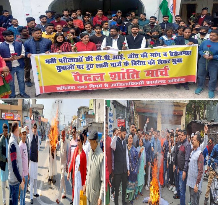 ऋषिकेश। देहरादून में हुए लाठी चार्ज को लेकर तीर्थनगरी के युवाओं में भी उबाल है। शुक्रवार को ऋषिकेश, डोईवाला, श्यामपुर, मुनिकीरेती में युवाओं ने प्रदेश सरकार के खिलाफ प्रदर्शन कर पुतला दहन किया। बेरोजगारों ने हाथों में गुलाब लेकर मौन जुलूस निकालकर विरोध जताया। उन्होंने भर्ती घोटालों में सीबीआई जांच करने की मांग की। शुक्रवार को कांग्रेस कार्यकर्ताओं ने रेलवे रोड स्थित कांग्रेस भवन के समक्ष प्रदेश सरकार का पुतला फूंका। एआईसीसी सदस्य जयेंद्र रमोला ने कहा कि बीते दो दिनों से उत्तराखंड के बेरोजगार युवा गांधी पार्क में शांतिपूर्वक प्रदर्शन कर रहे थे, इन युवाओं पर प्रदेश सरकार के निर्देश पर पुलिस ने बर्बरता पूवर्क लाठीचार्ज किया है, जो निंदनीय है। युवा कांग्रेस के जिलाध्यक्ष सन्नी प्रजापति ने कहा कि सरकार युवाओं की आवाज को दबाने का कार्य कर रही है। यूकां के विधानसभा अध्यक्ष गौरव राणा ने कहा कि प्रदेश सरकार द्वारा युवाओं के साथ बर्बरता की गई है, जो बेहद शर्मनाक है। सरकार हिटलरशाही दिखा रही है। प्रदर्शन करने वालों में दीपक जाटव, मदन मोहन शर्मा, शैलेंद्र बिष्ट, महंत विनय सारस्वत, ललित मोहन मिश्रा, पार्षद देवेंद्र प्रजापति, पार्षद राधा रमोला, पार्षद शकुंतला शर्मा, पार्षद जगत सिंह नेगी, जतिन जाटव, मुकेश जाटव, सरोजनी थपलियाल, संजय शर्मा, विक्रम भंडारी, राजेंद्र कोठारी, हरि सिंह नेगी, हरि राम वर्मा, प्रवीन जाटव, मनीष जाटव, कार्तिक, आशीष, अभिषेक पाल, हिमांशु जाटव, राहुल, अमन कुमार, आदित्य पाल, राजेश, प्रियांशु सारस्वत, रविंद्र यादव, सावित्री देवी, सूरज विश्नोई, बैसाख सिंह पयाल, विजय अग्रवाल, कमल बनर्जी, सिंह राज पोसवाल, रामकुमार भतालिये, अशोक शर्मा, संदीप कुमार आदि शामिल रहे।