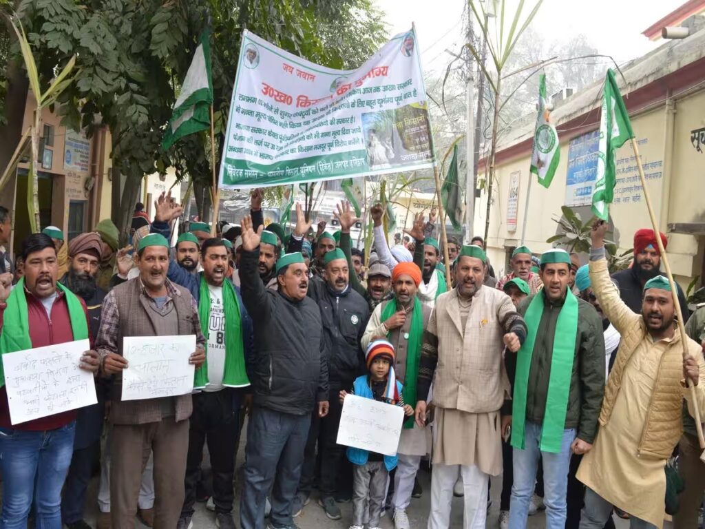 गन्नें हाथों में लेकर कचहरी पहुंचे किसान, दिया धरना