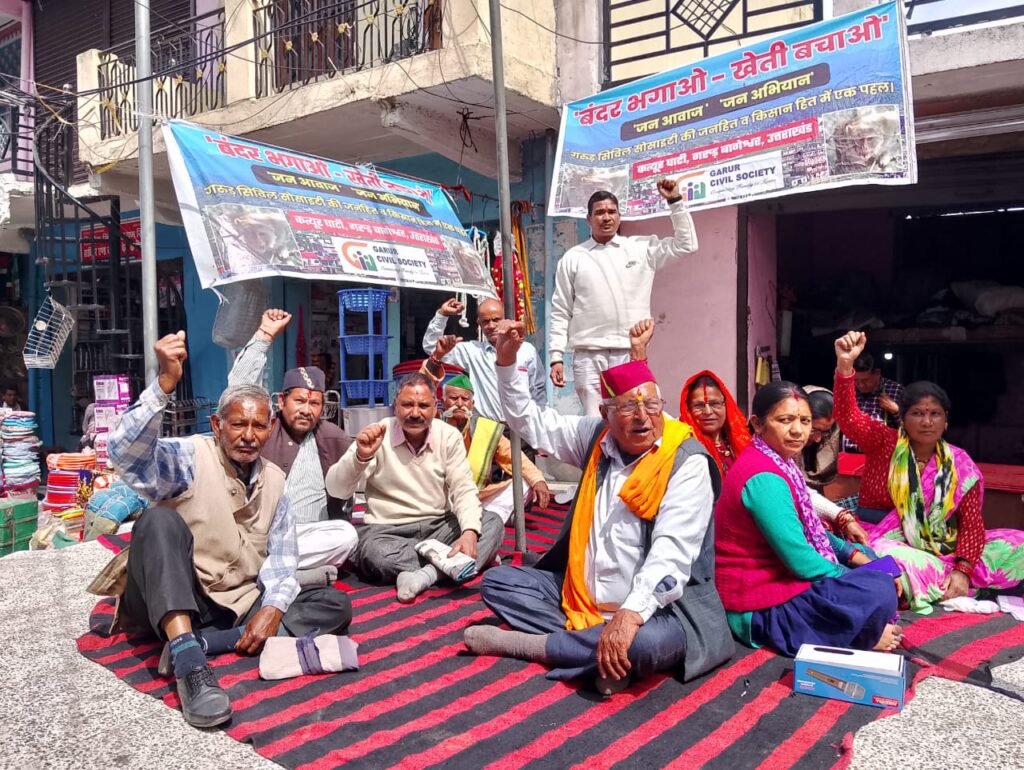 बागेश्वर गरुड़ । बंदर भगाओ खेती बचाओ जन अभियान के तहत गांधी चबूतरा गरुड़ में क्रमिक धरना दूसरे दिन भी जारी रहा।