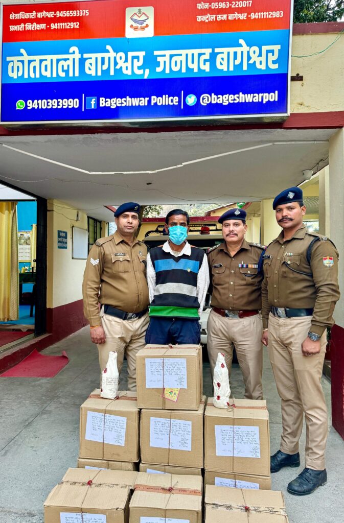 बागेश्वर । आगामी लोकसभा निर्वाचन के दृष्टिगत श्री अक्षय प्रहलाद कोंडे, पुलिस अधीक्षक जनपद बागेश्वर के आदेशानुसार, क्षेत्राधिकारी बागेश्वर के निर्देशन में जनपद पुलिस द्वारा अवैध शराब/मादक पदार्थों की तस्करी व बिक्री पर प्रभावी अंकुश लगाये जाने हेतु चलाये जा रहे अभियान के क्रम में दिनांक: 20-03-2024 को प्रभारी निरीक्षक के आदेशानुसार कोतवाली पुलिस द्वारा थाना क्षेत्रान्तर्गत शान्ति/सुरक्षा व्यवस्था ड्यूटी के दौरान गाड़गाव मार्ग कांडा रोड पर चाय के खोखे से अभियुक्त नवीन चन्द्र पुत्र श्री मोहन राम निवासी ग्राम नायल पोस्ट चमड़थल खोला खेत थाना कोतवाली बागेश्वर, जिला बागेश्वर उम्र 39 वर्ष को 10 पेटी (02 पेटी -अंग्रेजी शराब बरमुड़ा XXX रम, 8 पेटी- बाजपुर मसालेदार देशी शराब) अवैध शराब के साथ गिरफ्तार किया गया। आरोपी को पुलिस टीम द्वारा मौके से अवैध शराब के साथ गिरफ्तार कर उक्त के विरुद्ध कोतवाली बागेश्वर में FIR NO- 21/24 धारा 60 आबकारी अधिनियम का अभियोग पंजीकृत किया गयाl