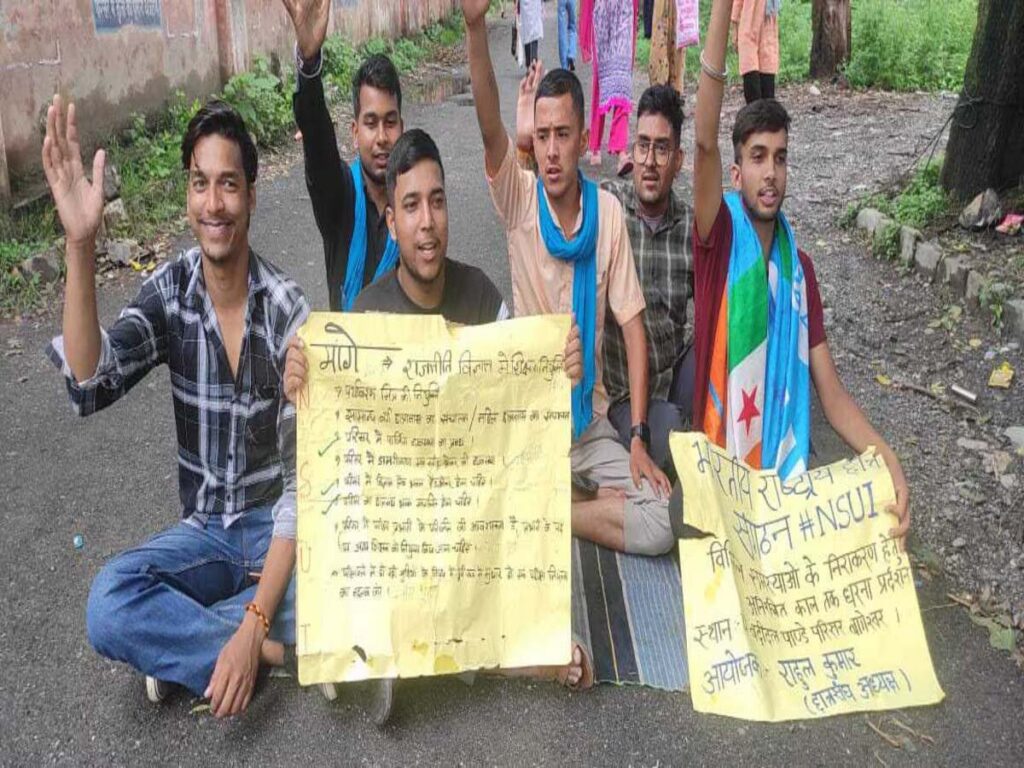 पांच सूत्रीय मांगों को लेकर एनएसयूआई का अनिश्चितकालीन धरना जारी