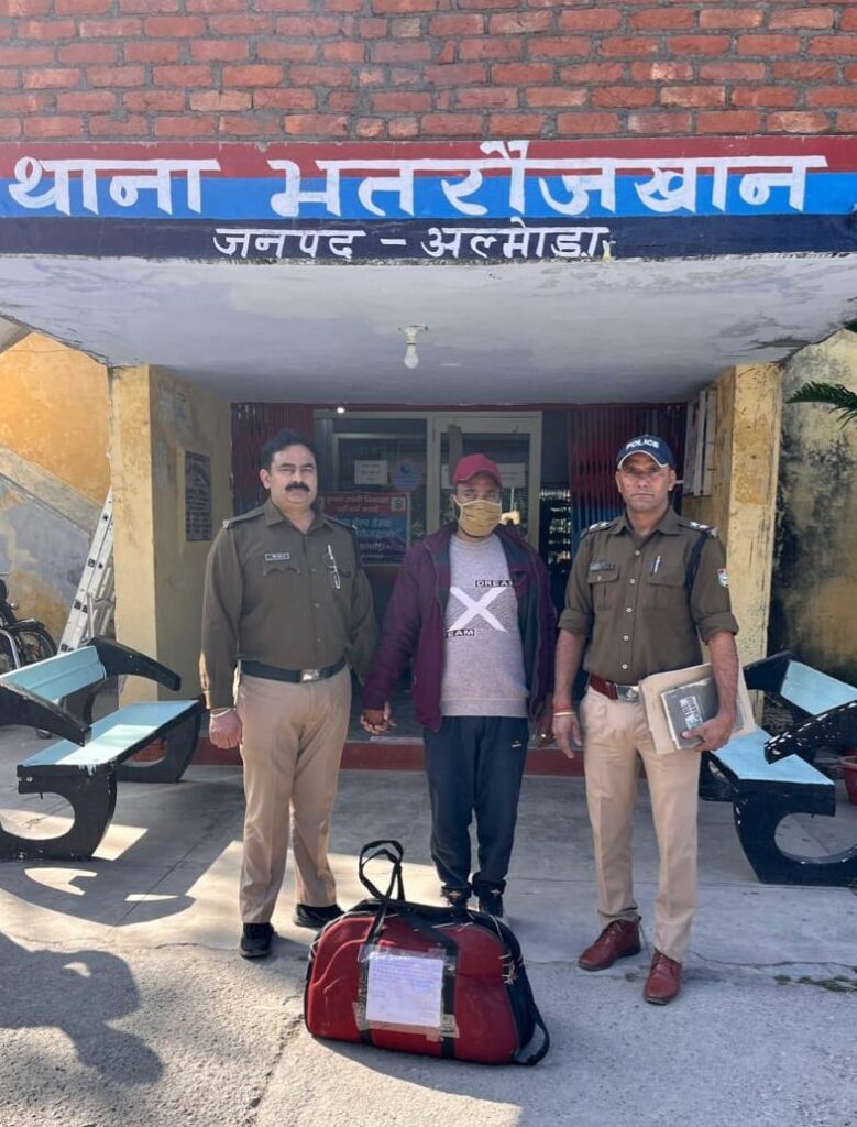 अल्मोड़ा । भतरौंजखान पुलिस ने मोटरसाइकिल से गांजा तस्करी कर रहे एक युवक को गांजे के साथ गिरफ्तार किया है व मामले में संलिप्त एक विधि विवादित किशोर को संरक्षण में लिया है। एसएसपी देवेन्द्र पींचा के निर्देशों पर भतरौजखान पुलिस टीम ने क्षेत्र में चैकिंग अभियान चलाया हुआ था। अभियान के दौरान आईएमपीसीएल की बाउंड्री के पास कच्चे रास्ते पर मोटरसाइकिल संख्या यूके 19-ए-2762 को रोककर चेक करने पर मोटरसाइकिल सवार एक युवक उस्मान (33 वर्ष) पुत्र इस्लाम निवासी पीरुमदारा, रामनगर जिला नैनीताल व एक विधि विवादित किशोर के कब्जे से कुल 4 किलो 940 ग्राम गांजा बरामद होने पर अभियुक्त उस्मान को गिरफ्तार किया गया व संलिप्त नाबालिग को संरक्षण में लिया गया। गांजा तस्करी में प्रयुक्त मोटरसाईकिल को सीज करते हुए अभियुक्त व विधि विवादित किशोर के विरुद्ध थाना भतरौजखान में एनडीपीएस अधिनियम के तहत एफआईआर पंजीकृत कर वैधानिक कार्यवाही की गई। पूछताछ में आरोपी ने बताया कि वह गांजा झीमार, सल्ट क्षेत्र से खरीदकर रामनगर तराई की तरफ ऊंचे दामों में बेचकर मुनाफा कमाने के उद्देश्य से ले जा रहा था। बरामद गांजे की अनुमानित कीमत 1.23 लाख रुपये बताई गई है। यहाँ थाना भतरौजखान पुलिस टीम से एसआई सुनील कुमार, हेड कांस्टेबल रविन्द्र सिंह, आनन्द त्रिपाठी, कांस्टेबल नीरज पाल शामिल रहे।