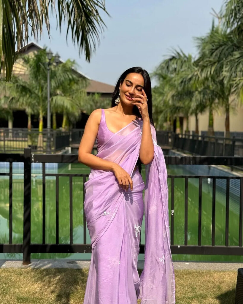 इन फोटोज में आप देख सकते हैं एक्ट्रेस सुरभि ने लैवेंडर कलर की सिंपल साड़ी पहनी हुई है, जिसके साथ उन्होंने स्लीवलेस ब्लाउज कैरी किया है। एक्ट्रेस अपने इस लुक में बेहद ही गॉर्जियस नजर आ रही हैं।