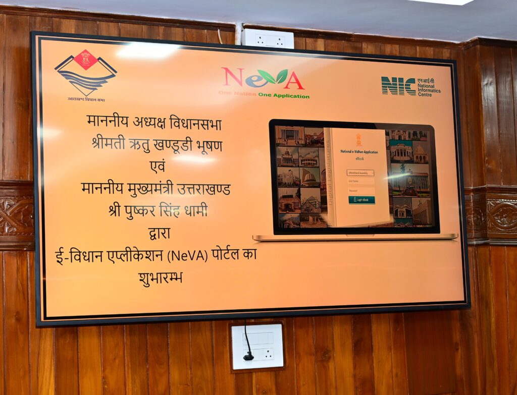 देहरादून । मुख्यमंत्री पुष्कर सिंह धामी ने विधानसभा अध्यक्ष ऋतु खण्डूडी भूषण की उपस्थिति में मंगलवार को ई-विधान एप्लीकेशन (NeVA) का लोकापर्ण किया। इस बार विधानसभा का बजट सत्र नेशनल ई- विधान एप्लीकेशन के तहत संचालित किया जा रहा है। उत्तराखण्ड में विधानसभा के कार्यों को डिजिटल और पेपरलेस बनाने के लिए ई-विधानसभा प्रणाली अपनाई गई है। इसके माध्यम से विधायकों को कार्यसूची, विधानसभा में पूछे गये प्रश्नों के जवाब और अन्य दस्तावेज अब ऑनलाइन उपलब्ध कराये जायेंगे। इसके तहत विधानसभा में विधायकों की टेबल पर टैबलेट लगाए गए हैं, और सभी दस्तावेज डिजिटल रूप से उपलब्ध कराए जा रहे हैं। इससे न केवल पर्यावरण संरक्षण में मदद मिलेगी, बल्कि विधानसभा की कार्यवाही भी अधिक दक्षता से संपन्न होगी। इस अवसर पर कैबिनेट मंत्रीगण और विधायकगण उपस्थित थे।