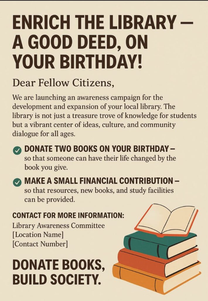 यह पहल समाज में एक सकारात्मक लहर पैदा कर रही है, जिसमें व्यक्ति अपने व्यक्तिगत उत्सवों को जनसेवा से जोड़कर आने वाली पीढ़ियों के लिए एक अमूल्य उपहार दे सकते हैं। एक पुस्तक किसी बच्चे का भविष्य बदल सकती है, और एक विचार पूरे समाज को दिशा दे सकता है। इच्छुक नागरिक पंजास चौराहा, गरुड़ स्थित पुस्तकालय से सीधे संपर्क कर सकते हैं या दिए गए संपर्क नंबरों पर अधिक जानकारी प्राप्त कर सकते हैं – 9411317871, 9412436112, 9675583051, 9412976904, 8979363640, 9389681553, 9319805337, 9818333220, 9711293624, 9456164404