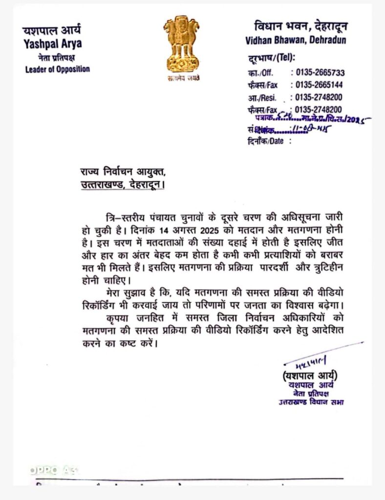 यशपाल आर्य के इस कदम को ग्रामीण चुनावों में पारदर्शिता और जनता के विश्वास को मजबूत करने की दिशा में अहम पहल माना जा रहा है।