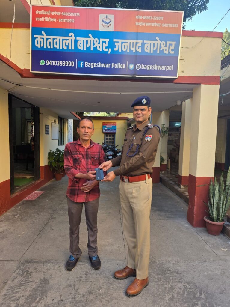बागेश्वर। जनपद बागेश्वर पुलिस ने एक बार फिर अपनी जनसेवा और संवेदनशीलता का परिचय दिया है। पुलिस अधीक्षक श्री चन्द्रशेखर घोडके (IPS) के निर्देशन में कोतवाली बागेश्वर पुलिस ने खोया हुआ मोबाइल फोन बरामद कर उसके स्वामी को सुपुर्द किया।