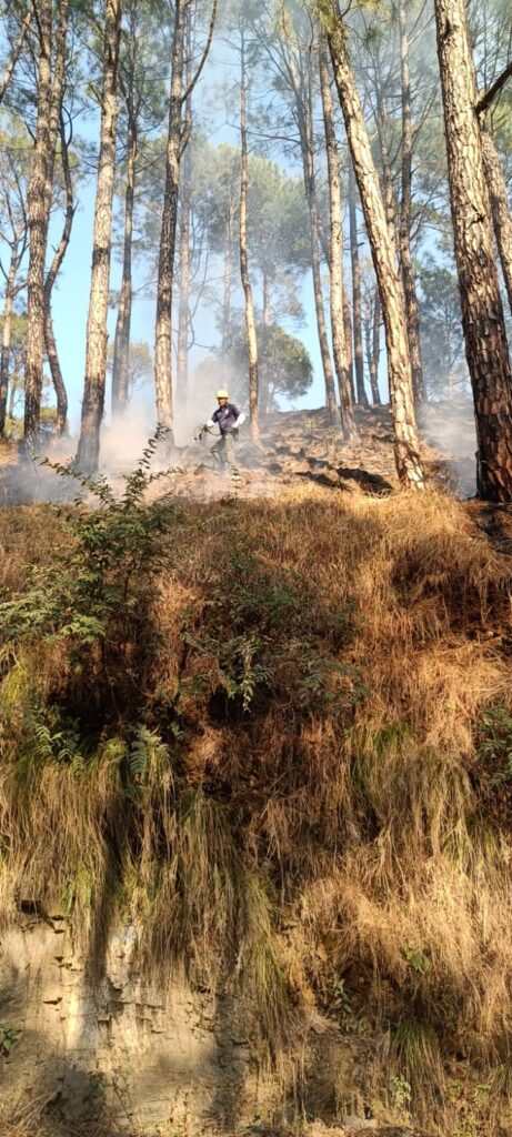 घटनास्थल पर पहुँचकर फायर टीम ने देखा कि चीड़ के पत्तों (पिरुल) और सूखी झाड़ियों के कारण आग तेजी से फैल रही थी। टीम द्वारा त्वरित कार्यवाही करते हुए मिनी हाई प्रेशर पंप की सहायता से पंपिंग शुरू की गई। अग्निशमन कर्मियों ने होज रील के माध्यम से पानी की धार व फुहार डालकर आग की लपटों को नियंत्रित किया और उसे पूरी तरह बुझा दिया।