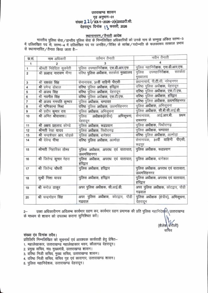 देहरादून । प्रदेश में हाल के दिनों में अपराध के बढ़ते ग्राफ और कानून-व्यवस्था को लेकर उठ रही चिंताओं के बीच ने पुलिस विभाग में एक महत्वपूर्ण प्रशासनिक फेरबदल करते हुए कई वरिष्ठ अधिकारियों के तबादले कर दिए हैं। गृह अनुभाग द्वारा जारी आदेश के अनुसार भारतीय पुलिस सेवा तथा प्रांतीय पुलिस सेवा के अधिकारियों को विभिन्न जिलों और इकाइयों में नई जिम्मेदारियाँ सौंपी गई हैं, ताकि पुलिस व्यवस्था को अधिक प्रभावी, चुस्त और परिणामोन्मुख बनाया जा सके।