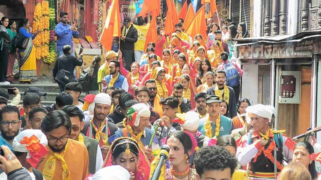 अल्मोड़ा । हिन्दू सेवा समिति द्वारा नव संवत्सर के अवसर पर सिद्धि नोला पलटन बाजार से नंदा देवी मंदिर तक भव्य सांस्कृतिक शोभायात्रा निकाली गई। शोभायात्रा मार्ग में विभिन्न स्थानों पर व्यापारियों ने जलपान की व्यवस्था कर स्वागत किया। इस दौरान सैकड़ों की संख्या में बच्चे, महिलाएं और शहर के नागरिक शामिल हुए। सांस्कृतिक दलों, बच्चों और महिलाओं द्वारा लगाए गए माता के जयकारों से पूरा बाजार गूंज उठा और वातावरण भक्तिमय बना रहा। विभिन्न क्षेत्रों की महिलाओं ने पारंपरिक परिधानों में प्रतिभाग कर शोभायात्रा को आकर्षक बनाया। समिति पिछले 11 वर्षों से इस आयोजन का निरंतर आयोजन करती आ रही है। आयोजन का उद्देश्य नव संवत्सर की शुभकामनाएं देना और सांस्कृतिक एकता को बढ़ावा देना है। कार्यक्रम में समिति के अध्यक्ष अजीत कार्की, विधायक मनोज तिवारी, पूर्व विधायक रघुनाथ चौहान, सुशील साह, कमल साह, नीरज बोरा, हरीश कनवाल, भैरव गोस्वामी, आशु गोस्वामी, पवन साह, पार्षद वैभव पांडे, गुंजन चम्याल, दीपक कुमार, अनुप भारती, दिनेश पांडे, दीपक शाह, भूपेंद्र भोज, आशीष वर्मा, रवि रौतेला, विपुल कार्की, पूरन रौतेला, बिन्नी वैष्णव, तारु जोशी, दीप डांगी, अमन नज्जोन, कार्तिक साह, निर्मल रावत, दर्शन रावत, प्रकाश भट्ट, विनीत बिष्ट, कैलाश गुरुरानी, प्रकाश बिष्ट सहित अन्य लोग मौजूद रहे।